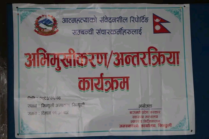 जनस्वास्थ्य कार्यालय सिन्धुलीको आयोजनामा शुक्रबार आत्महत्या जस्तो संवेदनशील विषयको समाचार सम्प्रेषणलाई मर्यादित, जिम्मेवार र तथ्यपरक बनाउने उद्देश्यले संचारकर्मीहरुसँग अभिमुखीकरण तथा अन्तरक्रिया कार्यक्रम गरिएको हो ।